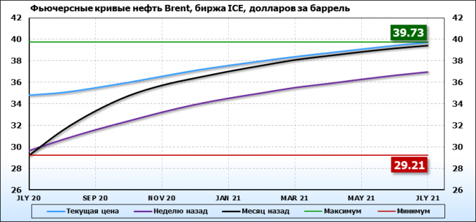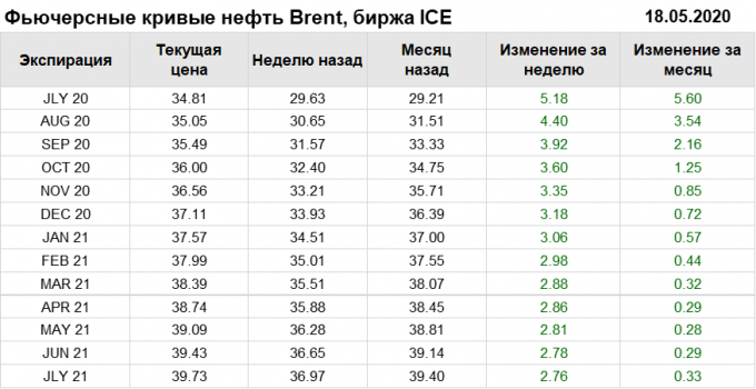 На 18.05.20 стоимость нефти марки Brent на бирже ICE по контракту JLY 20 составила 34.81 долларов за баррель. За прошедшую неделю стоимость нефти марки Brent выросла на 5.18 $/баррель. Как мы видим на графике, фьючерсная кривая на всем своем протяжении находится в состоянии контанго.