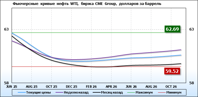 На 19.05.25 стоимость нефти марки WTI на бирже CME Group по контракту JUN 25 составила 62.69 доллара за баррель. За прошедшую неделю стоимость нефти марки WTI выросла на 0.74 $/баррель. Как мы видим на графике, фьючерсная кривая имеет периоды, когда более дальний фьючерс дешевле ближнего. Состояние бэквардации наблюдаем на следующих контрактах: JLY 25; AUG 25; SEP 25; OCT 25; NOV 25; DEC 25; JAN 26. Таким образом, трейдеры предполагают, что возможно превалирование предложения над спросом в указанные периоды, если рынок будет находиться на данных ценовых уровнях.