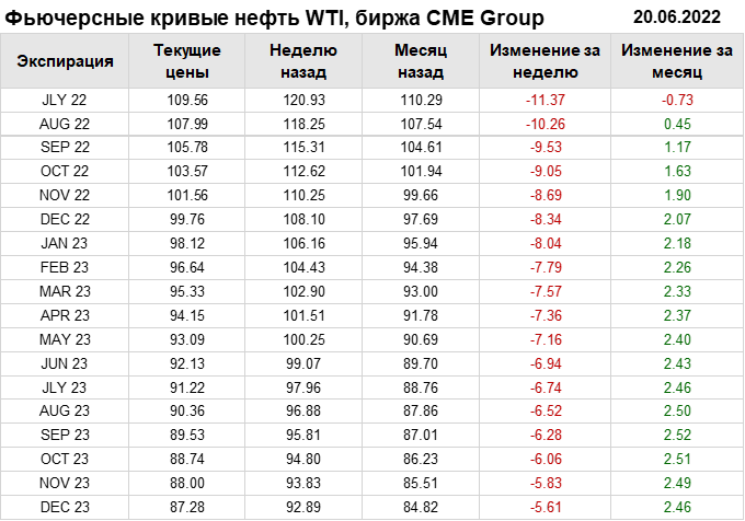 Нефть. Фьючерсные кривые на 20 июня 2022