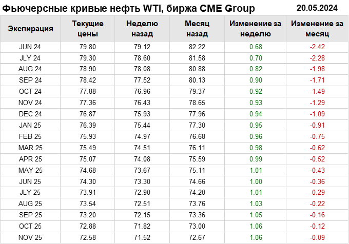 На 20.05.24 стоимость нефти марки WTI на бирже CME Group по контракту JUN 24 составила 79.8 доллара за баррель. За прошедшую неделю стоимость нефти марки WTI выросла на 0.68 $/баррель. Как мы видим на графике, фьючерсная кривая имеет периоды, когда более дальний фьючерс дешевле ближнего. Состояние бэквардации наблюдаем на следующих контрактах: JLY 24; AUG 24; SEP 24; OCT 24; NOV 24; DEC 24; JAN 25; FEB 25; MAR 25; APR 25; MAY 25; JUN 25; JLY 25; AUG 25; SEP 25; OCT 25; NOV 25.  Таким образом, трейдеры предполагают, что возможно превалирование предложения над спросом в указанные периоды, если рынок будет находиться на данных ценовых уровнях.