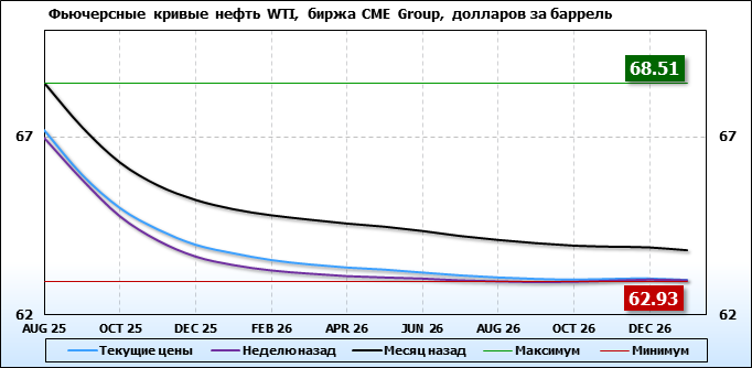На 21.07.25 стоимость нефти марки WTI на бирже CME Group по контракту AUG 25 составила 67.2 доллара за баррель. За прошедшую неделю стоимость нефти марки WTI выросла на 0.22 $/баррель. Как мы видим на графике, фьючерсная кривая имеет периоды, когда более дальний фьючерс дешевле ближнего. Состояние бэквардации наблюдаем на следующих контрактах: SEP 25; OCT 25; NOV 25; DEC 25; JAN 26; FEB 26; MAR 26; APR 26; MAY 26; JUN 26; JLY 26; AUG 26; SEP 26; OCT 26; JAN 27. Таким образом, трейдеры предполагают, что возможно превалирование предложения над спросом в указанные периоды, если рынок будет находиться на данных ценовых уровнях.
