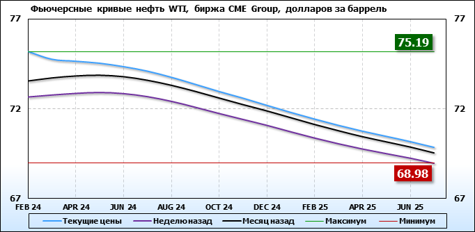 На 22.01.24 стоимость нефти марки WTI на бирже CME Group по контракту FEB 24 составила 75.19 доллара за баррель. За прошедшую неделю стоимость нефти марки WTI выросла на 2.51 $/баррель. Как мы видим на графике, фьючерсная кривая имеет периоды, когда более дальний фьючерс дешевле ближнего. Состояние бэквардации наблюдаем на следующих контрактах: MAR 24; APR 24; MAY 24; JUN 24; JLY 24; AUG 24; SEP 24; OCT 24; NOV 24; DEC 24; JAN 25; FEB 25; MAR 25; APR 25; MAY 25; JUN 25; JLY 25. Таким образом, трейдеры предполагают, что возможно превалирование предложения над спросом в указанные периоды, если рынок будет находиться на данных ценовых уровнях.