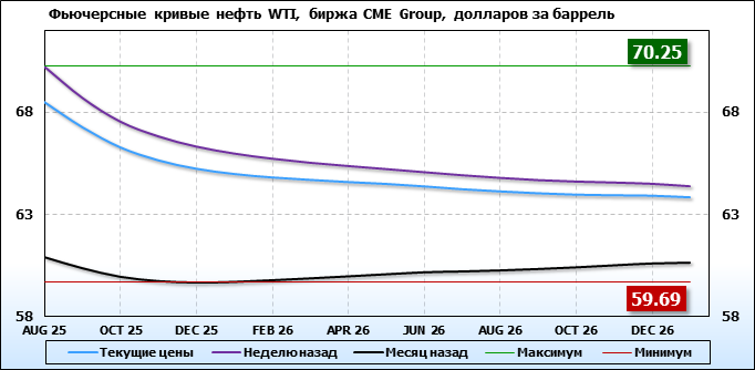 На 23.06.25 стоимость нефти марки WTI на бирже CME Group по контракту AUG 25 составила 68.51 доллара за баррель. За прошедшую неделю стоимость нефти марки WTI упала на 1.74 $/баррель. Как мы видим на графике, фьючерсная кривая имеет периоды, когда более дальний фьючерс дешевле ближнего. Состояние бэквардации наблюдаем на следующих контрактах: SEP 25; OCT 25; NOV 25; DEC 25; JAN 26; FEB 26; MAR 26; APR 26; MAY 26; JUN 26; JLY 26; AUG 26; SEP 26; OCT 26; NOV 26; DEC 26; JAN 27.  Таким образом, трейдеры предполагают, что возможно превалирование предложения над спросом в указанные периоды, если рынок будет находиться на данных ценовых уровнях.