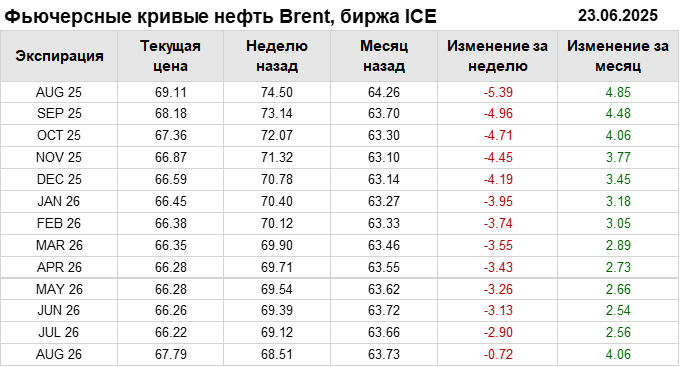 Нефть. Фьючерсные кривые на 23 июня 2025