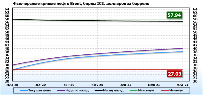 На 23.03.20 стоимость нефти марки Brent на бирже ICE по контракту MAY 20 составила 27.03 долларов за баррель. За прошедшую неделю стоимость нефти марки Brent упала на 3.02 $/баррель. Как мы видим на графике, фьючерсная кривая на всем своем протяжении находится в состоянии контанго.