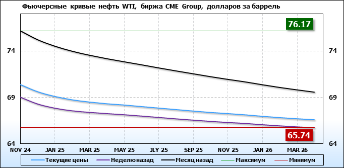 На 23.09.24 стоимость нефти марки WTI на бирже CME Group по контракту NOV 24 составила 70.37 доллара за баррель. За прошедшую неделю стоимость нефти марки WTI выросла на 1.35 $/баррель. Как мы видим на графике, фьючерсная кривая имеет периоды, когда более дальний фьючерс дешевле ближнего. Состояние бэквардации наблюдаем на следующих контрактах: DEC 24; JAN 25; FEB 25; MAR 25; APR 25; MAY 25; JUN 25; JLY 25; AUG 25; SEP 25; OCT 25; NOV 25; DEC 25; JAN 26; FEB 26; MAR 26; APR 26. Таким образом, трейдеры предполагают, что возможно превалирование предложения над спросом в указанные периоды, если рынок будет находиться на данных ценовых уровнях.