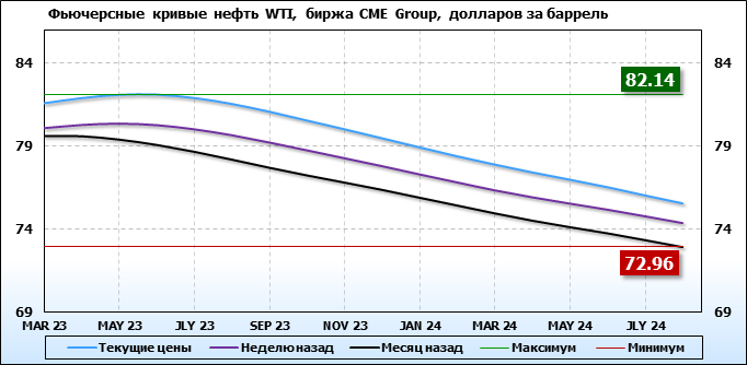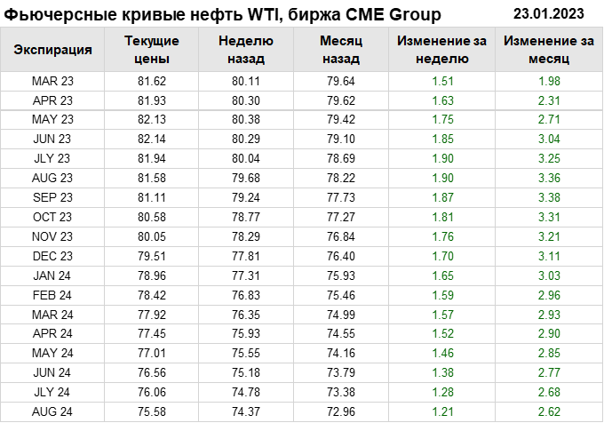 На 23.01.23 стоимость нефти марки WTI на бирже CME Group по контракту MAR 23 составила 81.62 доллара за баррель. За прошедшую неделю стоимость нефти марки WTI выросла на 1.51 $/баррель. Как мы видим на графике, фьючерсная кривая имеет периоды, когда более дальний фьючерс дешевле ближнего. Состояние бэквардации наблюдаем на следующих контрактах: JLY 23; AUG 23; SEP 23; OCT 23; NOV 23; DEC 23; JAN 24; FEB 24; MAR 24; APR 24; MAY 24; JUN 24; JLY 24; AUG 24. Таким образом, трейдеры предполагают, что возможно превалирование предложения над спросом в указанные периоды, если рынок будет находиться на данных ценовых уровнях.