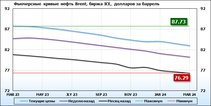 На 23.01.23 стоимость нефти марки Brent на бирже ICE по контракту MAR 23 составила 87.73 доллара за баррель. За прошедшую неделю стоимость нефти марки Brent выросла на 3.03 $/баррель. Как мы видим на графике, фьючерсная кривая имеет периоды, когда более дальний фьючерс дешевле ближнего. Состояние бэквардации наблюдаем на следующих контрактах: APR 23; MAY 23; JUN 23; JLY 23; AUG 23; SEP 23; OCT 23; NOV 23; DEC 23; ; FEB 24; MAR 24. Таким образом, трейдеры предполагают, что возможно превалирование предложения над спросом в указанные периоды, если рынок будет находиться на данных ценовых уровнях.