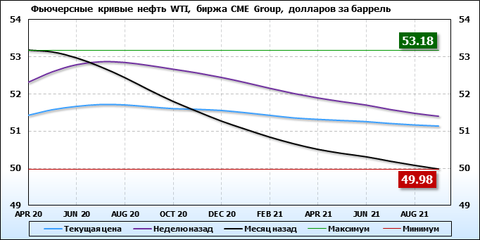 На 24.02.20 стоимость нефти марки WTI на бирже CME Group по контракту APR 20 составила 51.43 доллара за баррель. За прошедшую неделю стоимость нефти марки WTI упала на 0.89 $/баррель. Как мы видим на графике, фьючерсная кривая имеет периоды, когда более дальний фьючерс дешевле ближнего. Состояние бэквардации наблюдаем на следующих контрактах: AUG 20; SEP 20; OCT 20; NOV 20; DEC 20; JAN 21; FEB 21; MAR 21; APR 21; MAY 21; JUN 21; JLY 21; AUG 21; SEP 21. Таким образом, трейдеры предполагают, что возможно превалирование предложения над спросом в указанные периоды, если рынок будет находиться на данных ценовых уровнях.