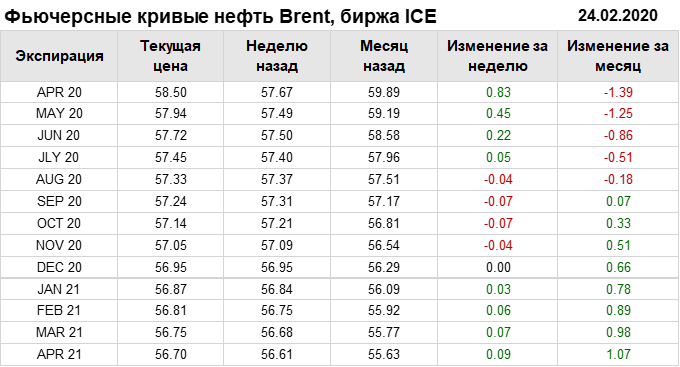 Нефть. Фьючерсные кривые на 24 февраля 2020