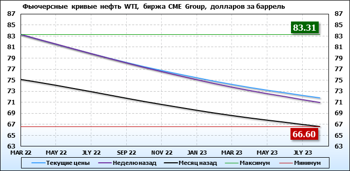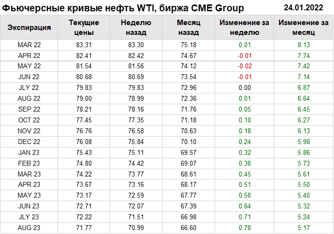 На 24.01.22 стоимость нефти марки WTI на бирже CME Group по контракту MAR 22 составила 83.31 доллара за баррель. За прошедшую неделю стоимость нефти марки WTI выросла на 0.01 $/баррель. Как мы видим на графике, фьючерсная кривая имеет периоды, когда более дальний фьючерс дешевле ближнего. Состояние бэквардации наблюдаем на следующих контрактах: APR 22; MAY 22; JUN 22; JLY 22; AUG 22; SEP 22; OCT 22; NOV 22; DEC 22; JAN 23; FEB 23; MAR 23; APR 23; MAY 23; JUN 23; JLY 23; AUG 23. Таким образом, трейдеры предполагают, что возможно превалирование предложения над спросом в указанные периоды, если рынок будет находиться на данных ценовых уровнях.