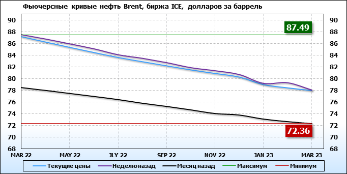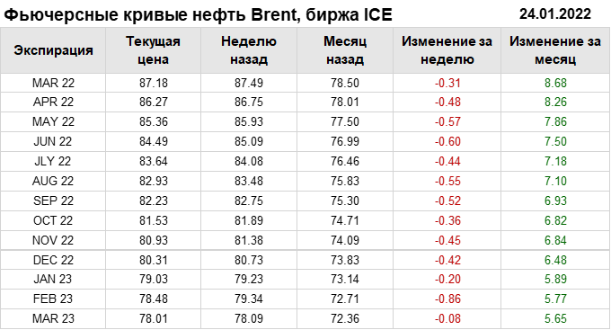 На 24.01.22 стоимость нефти марки Brent на бирже ICE по контракту MAR 22 составила 87.18 доллара за баррель. За прошедшую неделю стоимость нефти марки Brent упала на 0.31 $/баррель. Как мы видим на графике, фьючерсная кривая имеет периоды, когда более дальний фьючерс дешевле ближнего. Состояние бэквардации наблюдаем на следующих контрактах: APR 22; MAY 22; JUN 22; JLY 22; AUG 22; SEP 22; OCT 22; NOV 22; DEC 22; JAN 23; FEB 23; MAR 23. Таким образом, трейдеры предполагают, что возможно превалирование предложения над спросом в указанные периоды, если рынок будет находиться на данных ценовых уровнях.