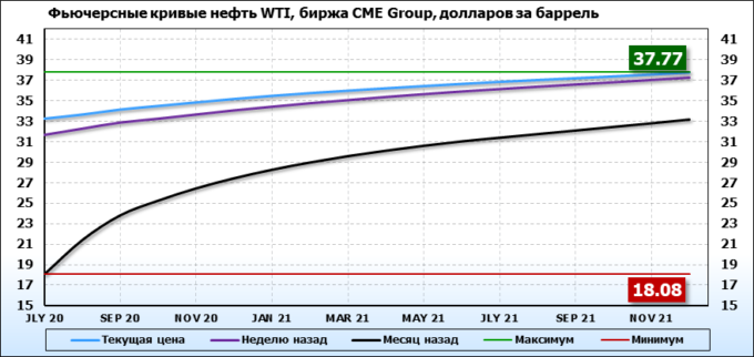 На 25.05.20 стоимость нефти марки WTI на бирже CME Group по контракту JLY 20 составила 33.25 долларов за баррель. За прошедшую неделю стоимость нефти марки WTI выросла на 1.6 $/баррель. Как мы видим на графике, фьючерсная кривая на всем своем протяжении находится в состоянии контанго. Трейдеры не предполагают превышения предложения над спросом при сохранении текущих цен.