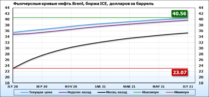 На 25.05.20 стоимость нефти марки Brent на бирже ICE по контракту JLY 20 составила 35.53 долларов за баррель. За прошедшую неделю стоимость нефти марки Brent выросла на 0.72 $/баррель. Как мы видим на графике, фьючерсная кривая на всем своем протяжении находится в состоянии контанго.