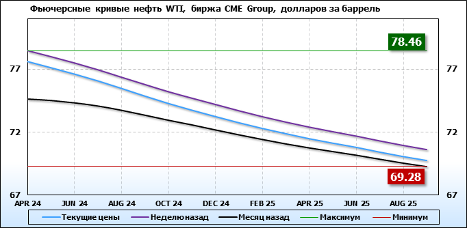На 26.02.24 стоимость нефти марки WTI на бирже CME Group по контракту APR 24 составила 77.58 доллара за баррель. За прошедшую неделю стоимость нефти марки WTI упала на 0.88 $/баррель. Как мы видим на графике, фьючерсная кривая имеет периоды, когда более дальний фьючерс дешевле ближнего. Состояние бэквардации наблюдаем на следующих контрактах: MAY 24; JUN 24; JLY 24; AUG 24; SEP 24; OCT 24; NOV 24; DEC 24; JAN 25; FEB 25; MAR 25; APR 25; MAY 25; JUN 25; JLY 25; AUG 25; SEP 25.  Таким образом, трейдеры предполагают, что возможно превалирование предложения над спросом в указанные периоды, если рынок будет находиться на данных ценовых уровнях.