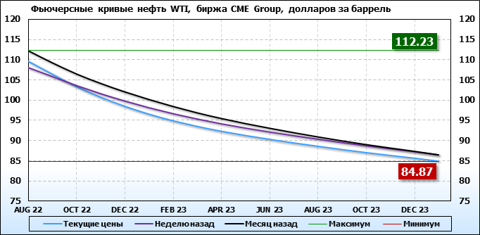 На 27.06.22 стоимость нефти марки WTI на бирже CME Group по контракту AUG 22 составила 109.57 долларов за баррель. За прошедшую неделю стоимость нефти марки WTI выросла на 1.58 $/баррель. Как мы видим на графике, фьючерсная кривая имеет периоды, когда более дальний фьючерс дешевле ближнего. Состояние бэквардации наблюдаем на следующих контрактах: SEP 22; OCT 22; NOV 22; DEC 22; JAN 23; FEB 23; MAR 23; APR 23; MAY 23; JUN 23; JLY 23; AUG 23; SEP 23; OCT 23; NOV 23; DEC 23; JAN 24. Таким образом, трейдеры предполагают, что возможно превалирование предложения над спросом в указанные периоды, если рынок будет находиться на данных ценовых уровнях.
