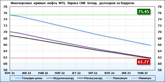 На 27.09.21 стоимость нефти марки WTI на бирже CME Group по контракту NOV 21 составила 75.45 доллара за баррель. За прошедшую неделю стоимость нефти марки WTI выросла на 5.31 $/баррель. Как мы видим на графике, фьючерсная кривая имеет периоды, когда более дальний фьючерс дешевле ближнего. Состояние бэквардации наблюдаем на следующих контрактах: DEC 21; JAN 22; FEB 22; MAR 22; APR 22; MAY 22; JUN 22; JLY 22; AUG 22; SEP 22; OCT 22; NOV 22; DEC 22; JAN 23; FEB 23; MAR 23; APR 23. Таким образом, трейдеры предполагают, что возможно превалирование предложения над спросом в указанные периоды, если рынок будет находиться на данных ценовых уровнях.