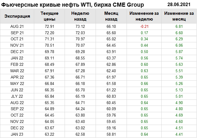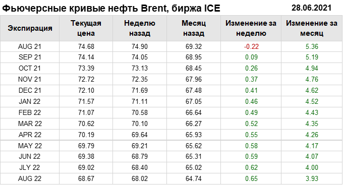 Нефть. Фьючерсные кривые на 28 июня 2021