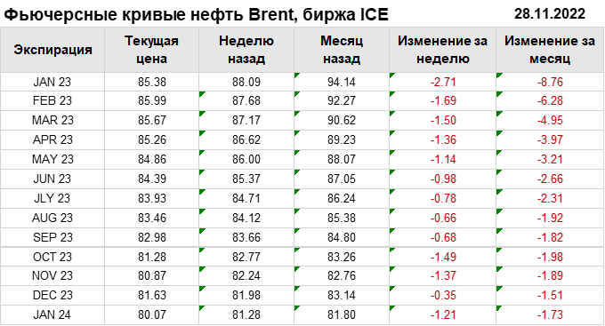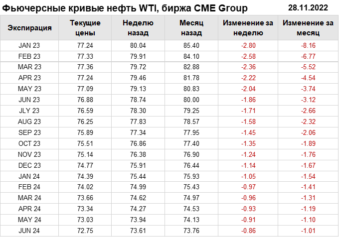 Нефть. Фьючерсные кривые на 28 ноября 2022