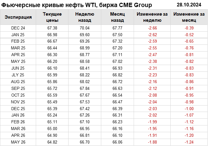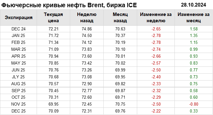 Нефть. Фьючерсные кривые на 28 октября 2024