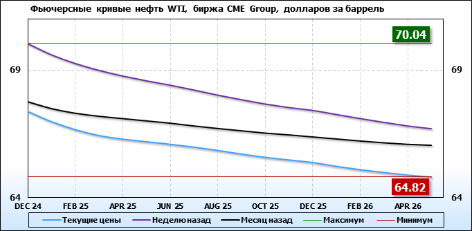 На 28.10.24 стоимость нефти марки WTI на бирже CME Group по контракту DEC 24 составила 67.38 доллара за баррель. За прошедшую неделю стоимость нефти марки WTI упала на 2.66 $/баррель. Как мы видим на графике, фьючерсная кривая имеет периоды, когда более дальний фьючерс дешевле ближнего. Состояние бэквардации наблюдаем на следующих контрактах: JAN 25; FEB 25; MAR 25; APR 25; MAY 25; JUN 25; JLY 25; AUG 25; SEP 25; OCT 25; NOV 25; DEC 25; JAN 26; FEB 26; MAR 26; APR 26; MAY 26.  Таким образом, трейдеры предполагают, что возможно превалирование предложения над спросом в указанные периоды, если рынок будет находиться на данных ценовых уровнях.