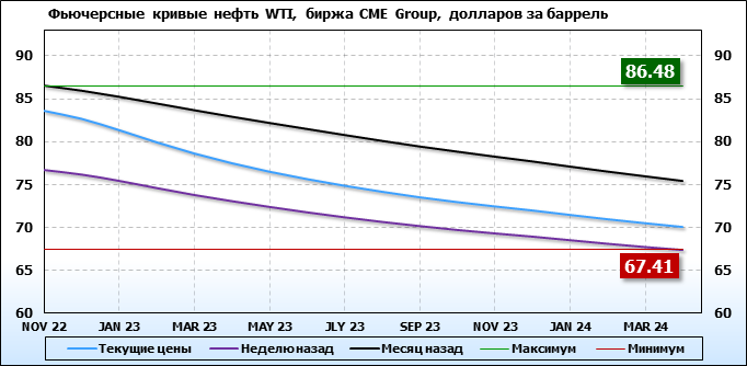 На 03.10.22 стоимость нефти марки WTI на бирже CME Group по контракту NOV 22 составила 83.63 доллара за баррель. За прошедшую неделю стоимость нефти марки WTI выросла на 6.92 $/баррель. Как мы видим на графике, фьючерсная кривая имеет периоды, когда более дальний фьючерс дешевле ближнего. Состояние бэквардации наблюдаем на следующих контрактах: DEC 22; JAN 23; FEB 23; MAR 23; APR 23; MAY 23; JUN 23; JLY 23; AUG 23; SEP 23; OCT 23; NOV 23; DEC 23; JAN 24; FEB 24; MAR 24; APR 24. Таким образом, трейдеры предполагают, что возможно превалирование предложения над спросом в указанные периоды, если рынок будет находиться на данных ценовых уровнях.