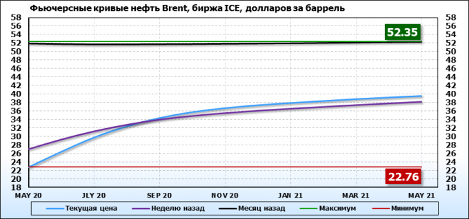 На 30.03.20 стоимость нефти марки Brent на бирже ICE по контракту MAY 20 составила 22.76 долларов за баррель. За прошедшую неделю стоимость нефти марки Brent упала на 4.27 $/баррель. Как мы видим на графике, фьючерсная кривая на всем своем протяжении находится в состоянии контанго.