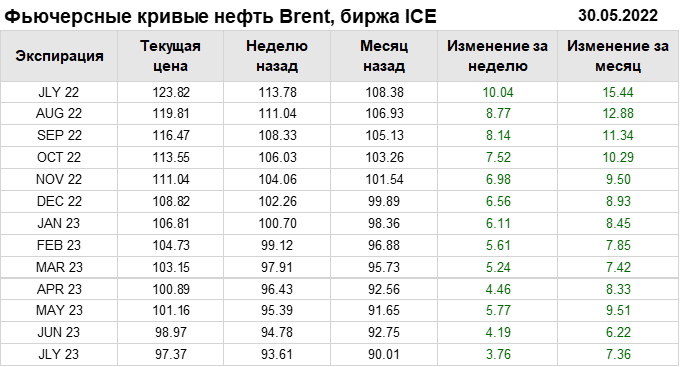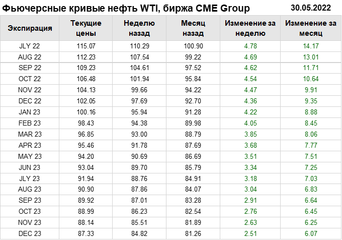 Нефть. Фьючерсные кривые на 30 мая 2022