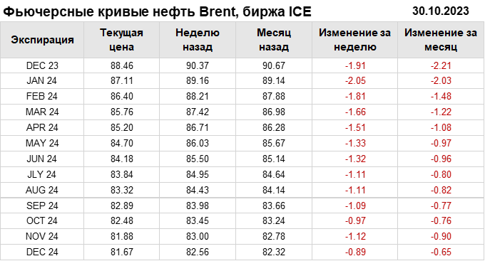 Нефть. Фьючерсные кривые на 30 октября 2023