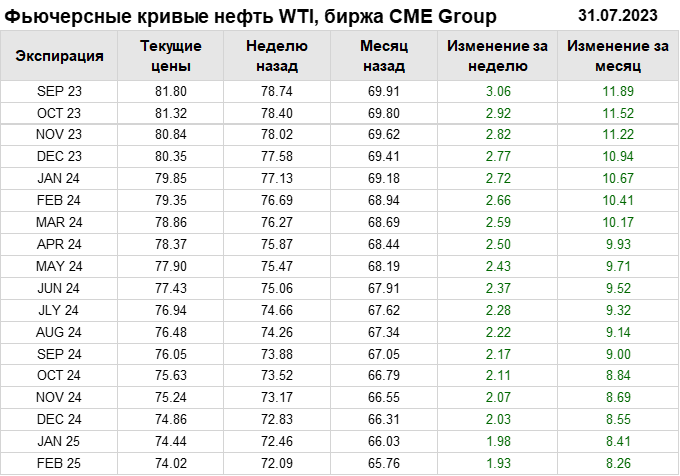 Нефть. Фьючерсные кривые на 31 июля 2023