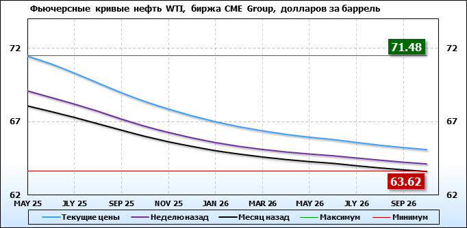 На 31.03.25 стоимость нефти марки WTI на бирже CME Group по контракту MAY 25 составила 71.48 доллара за баррель. За прошедшую неделю стоимость нефти марки WTI выросла на 2.37 $/баррель. Как мы видим на графике, фьючерсная кривая имеет периоды, когда более дальний фьючерс дешевле ближнего. Состояние бэквардации наблюдаем на следующих контрактах: JUN 25; JLY 25; AUG 25; SEP 25; OCT 25; NOV 25; DEC 25; JAN 26; FEB 26; MAR 26; APR 26; MAY 26; JUN 26; JLY 26; AUG 26; SEP 26; OCT 26. Таким образом, трейдеры предполагают, что возможно превалирование предложения над спросом в указанные периоды, если рынок будет находиться на данных ценовых уровнях.