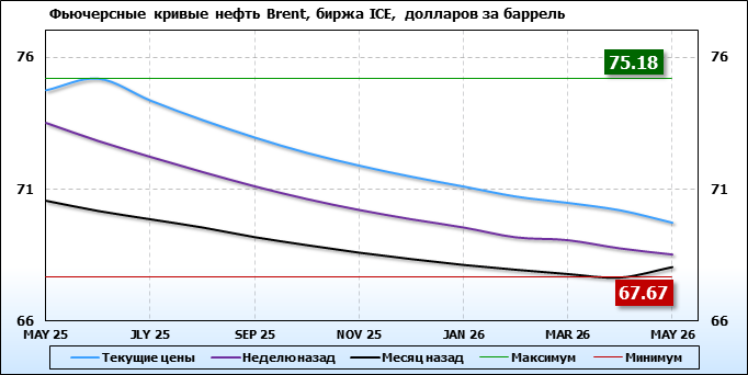 На 31.03.25 стоимость нефти марки Brent на бирже ICE по контракту MAY 25 составила 74.74 доллара за баррель. За прошедшую неделю стоимость нефти марки Brent выросла на 1.25 $/баррель. Как мы видим на графике, фьючерсная кривая имеет периоды, когда более дальний фьючерс дешевле ближнего. Состояние бэквардации наблюдаем на следующих контрактах: ; JLY 25; AUG 25; SEP 25; OCT 25; NOV 25; DEC 25; JAN 26; FEB 26; MAR 26; APR 26; MAY 26. Таким образом, трейдеры предполагают, что возможно превалирование предложения над спросом в указанные периоды, если рынок будет находиться на данных ценовых уровнях.