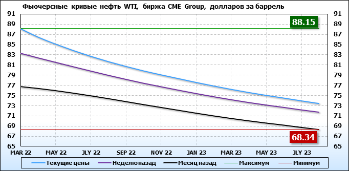 На 31.01.22 стоимость нефти марки WTI на бирже CME Group по контракту MAR 22 составила 88.15 доллара за баррель. За прошедшую неделю стоимость нефти марки WTI выросла на 4.84 $/баррель. Как мы видим на графике, фьючерсная кривая имеет периоды, когда более дальний фьючерс дешевле ближнего. Состояние бэквардации наблюдаем на следующих контрактах: APR 22; MAY 22; JUN 22; JLY 22; AUG 22; SEP 22; OCT 22; NOV 22; DEC 22; JAN 23; FEB 23; MAR 23; APR 23; MAY 23; JUN 23; JLY 23; AUG 23. Таким образом, трейдеры предполагают, что возможно превалирование предложения над спросом в указанные периоды, если рынок будет находиться на данных ценовых уровнях.