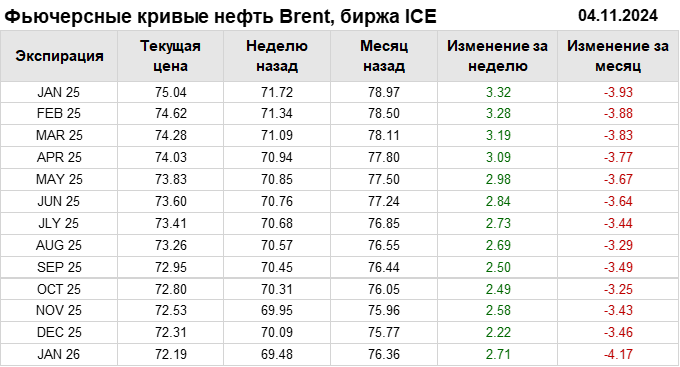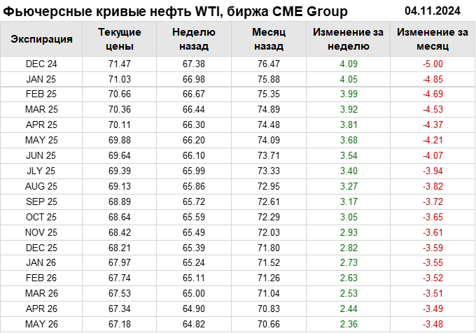 Нефть. Фьючерсные кривые на 4 ноября 2024