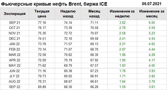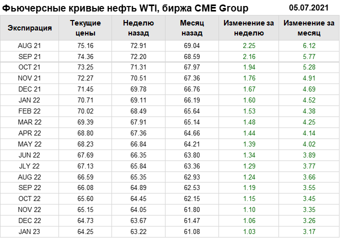 Нефть. Фьючерсные кривые на 5 июля 2021