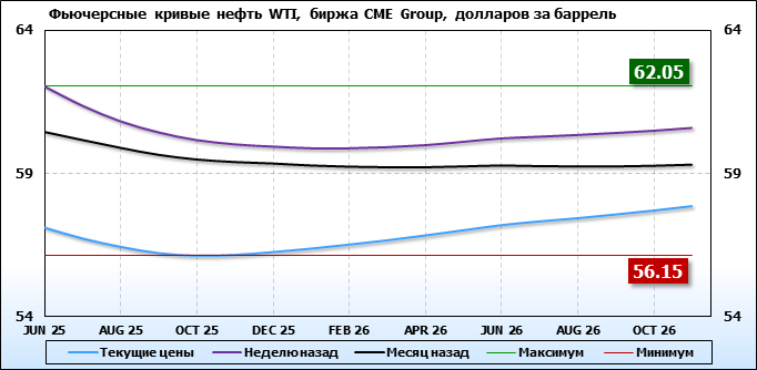 На 05.05.25 стоимость нефти марки WTI на бирже CME Group по контракту JUN 25 составила 57.13 доллара за баррель. За прошедшую неделю стоимость нефти марки WTI упала на 4.92 $/баррель. Как мы видим на графике, фьючерсная кривая имеет периоды, когда более дальний фьючерс дешевле ближнего. Состояние бэквардации наблюдаем на следующих контрактах: JLY 25; AUG 25; SEP 25; OCT 25. Таким образом, трейдеры предполагают, что возможно превалирование предложения над спросом в указанные периоды, если рынок будет находиться на данных ценовых уровнях.
