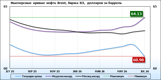 На 05.05.25 стоимость нефти марки Brent на бирже ICE по контракту JLY 25 составила 61.93 доллара за баррель. За прошедшую неделю стоимость нефти марки Brent упала на 1.85 $/баррель. Как мы видим на графике, фьючерсная кривая имеет периоды, когда более дальний фьючерс дешевле ближнего. Состояние бэквардации наблюдаем на следующих контрактах: AUG 25; SEP 25; OCT 25; JUL 26. Таким образом, трейдеры предполагают, что возможно превалирование предложения над спросом в указанные периоды, если рынок будет находиться на данных ценовых уровнях.