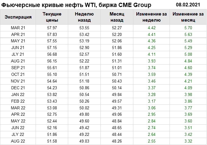 Нефть. Фьючерсные кривые на 8 февраля 2021