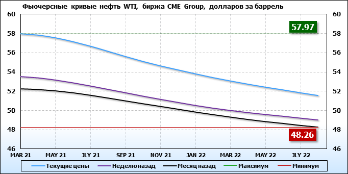 На 08.02.21 стоимость нефти марки WTI на бирже CME Group по контракту MAR 21 составила 57.97 доллара за баррель. За прошедшую неделю стоимость нефти марки WTI выросла на 4.42 $/баррель. Как мы видим на графике, фьючерсная кривая имеет периоды, когда более дальний фьючерс дешевле ближнего. Состояние бэквардации наблюдаем на следующих контрактах: APR 21; MAY 21; JUN 21; JLY 21; AUG 21; SEP 21; OCT 21; NOV 21; DEC 21; JAN 22; FEB 22; MAR 22; APR 22; MAY 22; JUN 22; JLY 22; AUG 22. Таким образом, трейдеры предполагают, что возможно превалирование предложения над спросом в указанные периоды, если рынок будет находиться на данных ценовых уровнях.