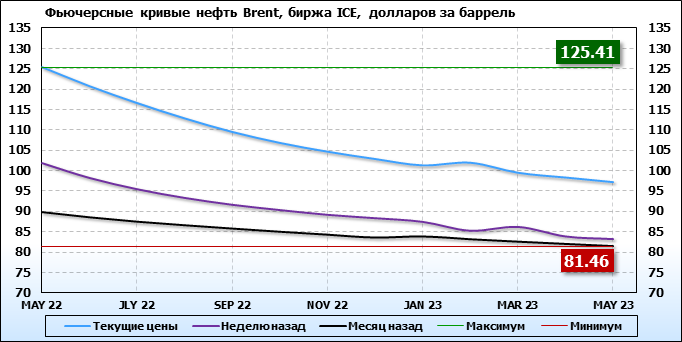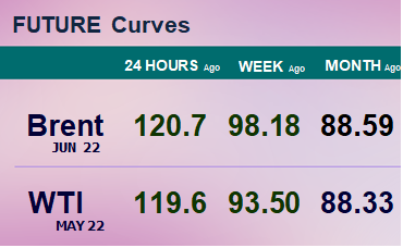 На 08.03.22 стоимость нефти марки Brent на бирже ICE по контракту MAY 22 составила 125.41 долларов за баррель. За прошедшую неделю стоимость нефти марки Brent выросла на 23.58 $/баррель. Как мы видим на графике, фьючерсная кривая имеет периоды, когда более дальний фьючерс дешевле ближнего. Состояние бэквардации наблюдаем на следующих контрактах: JUN 22; JLY 22; AUG 22; SEP 22; OCT 22; NOV 22; DEC 22; JAN 23; ; MAR 23; APR 23; MAY 23. Таким образом, трейдеры предполагают, что возможно превалирование предложения над спросом в указанные периоды, если рынок будет находиться на данных ценовых уровнях.