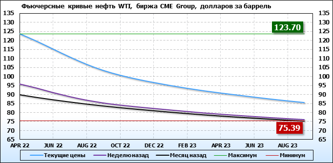На 08.03.22 стоимость нефти марки WTI на бирже CME Group по контракту APR 22 составила 123.7 долларов за баррель. За прошедшую неделю стоимость нефти марки WTI выросла на 27.98 $/баррель. Как мы видим на графике, фьючерсная кривая имеет периоды, когда более дальний фьючерс дешевле ближнего. Состояние бэквардации наблюдаем на следующих контрактах: MAY 22; JUN 22; JLY 22; AUG 22; SEP 22; OCT 22; NOV 22; DEC 22; JAN 23; FEB 23; MAR 23; APR 23; MAY 23; JUN 23; JLY 23; AUG 23; SEP 23. Таким образом, трейдеры предполагают, что возможно превалирование предложения над спросом в указанные периоды, если рынок будет находиться на данных ценовых уровнях.