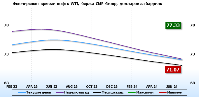 На 09.01.23 стоимость нефти марки WTI на бирже CME Group по контракту FEB 23 составила 74.63 доллара за баррель. За прошедшую неделю стоимость нефти марки WTI упала на 2.3 $/баррель. Как мы видим на графике, фьючерсная кривая имеет периоды, когда более дальний фьючерс дешевле ближнего. Состояние бэквардации наблюдаем на следующих контрактах: JLY 23; AUG 23; SEP 23; OCT 23; NOV 23; DEC 23; JAN 24; FEB 24; MAR 24; APR 24; MAY 24; JUN 24; JLY 24. Таким образом, трейдеры предполагают, что возможно превалирование предложения над спросом в указанные периоды, если рынок будет находиться на данных ценовых уровнях.