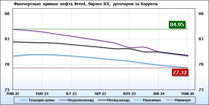 На 09.01.23 стоимость нефти марки Brent на бирже ICE по контракту MAR 23 составила 79.67 доллара за баррель. За прошедшую неделю стоимость нефти марки Brent упала на 5.28 $/баррель. Как мы видим на графике, фьючерсная кривая имеет периоды, когда более дальний фьючерс дешевле ближнего. Состояние бэквардации наблюдаем на следующих контрактах: ; ; JUN 23; JLY 23; AUG 23; SEP 23; OCT 23; NOV 23; DEC 23; JAN 24; FEB 24; MAR 24. Таким образом, трейдеры предполагают, что возможно превалирование предложения над спросом в указанные периоды, если рынок будет находиться на данных ценовых уровнях.