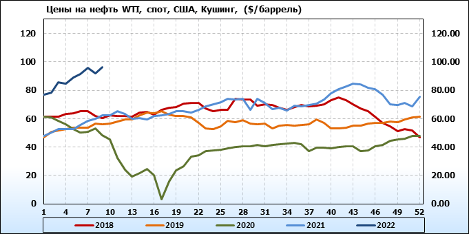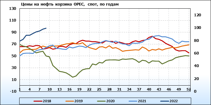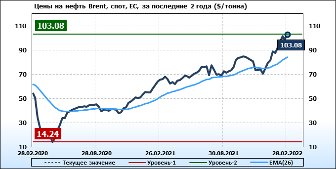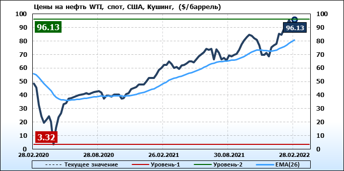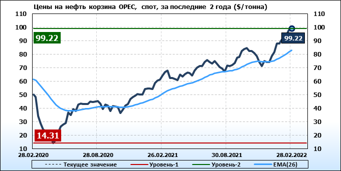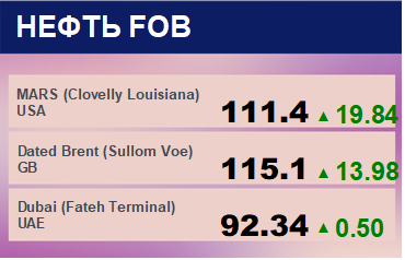 Цены на нефть сорта WTI с базиса поставки Кушинг выросли на 4.02 до 96.13 долларов за баррель. Тренд на рынке WTI бычий. Цены на нефть сорта Brent с поставкой из портов ЕС выросли на 4.35 до 103.08 долларов за баррель. Тренд на рынке Brent растущий. Цены на корзину сортов нефти стран членов ОПЕК выросли на 1.28 до 99.22 долларов за баррель. Ценовая тенденция по корзине ОПЕК направлена вверх. Цена на сорт MARS выросла на 19.84 до 111.45 долларов за баррель. Цена на сорт Oman выросла на 18.1 до 112.68 долларов за баррель. Сорт марки Dubai подорожал на 0.5 до 92.34 долларов за баррель.