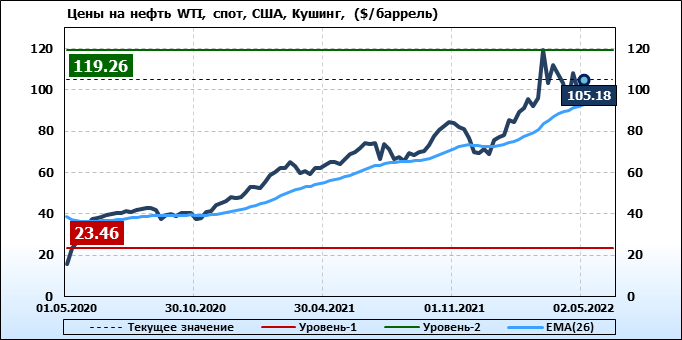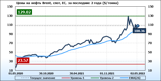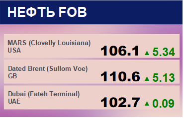 Цены на нефть сорта WTI с базиса поставки Кушинг выросли на 5.58 до 105.18 долларов за баррель. Тренд на рынке WTI бычий. Цены на нефть сорта Brent с поставкой из портов ЕС выросли на 9.09 до 108.36 долларов за баррель. Тренд на рынке Brent растущий. Цены на корзину сортов нефти стран членов ОПЕК выросли на 8.36 до 110.29 долларов за баррель. Ценовая тенденция по корзине ОПЕК направлена вверх. Цена на сорт MARS выросла на 5.34 до 106.16 долларов за баррель. Цена на сорт Oman выросла на 3.74 до 105.92 долларов за баррель. Сорт марки Dubai подорожал на 0.09 до 102.79 долларов за баррель.