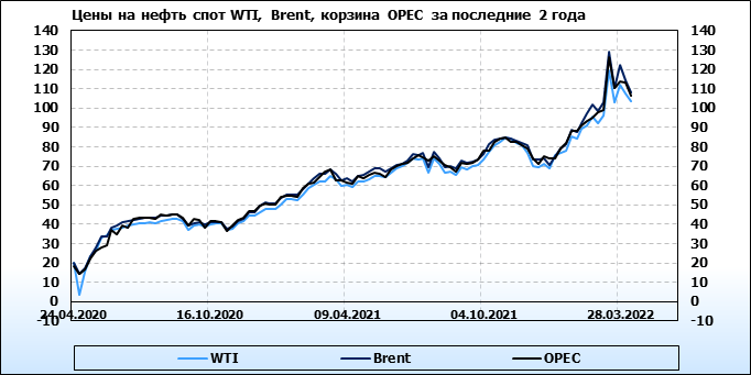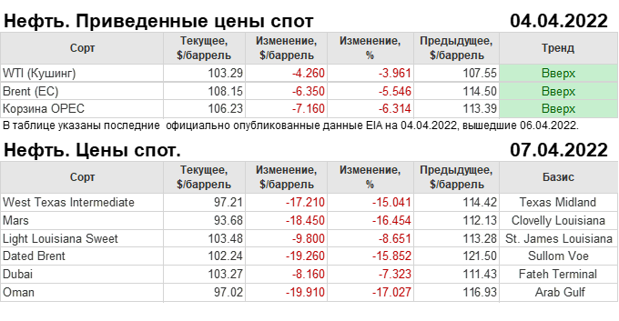 Нефть. Мировые цены спот по сортам и базисам. Данные на 07.04.2022