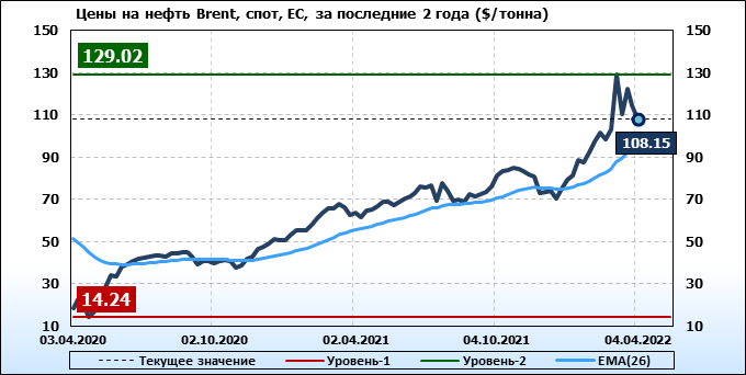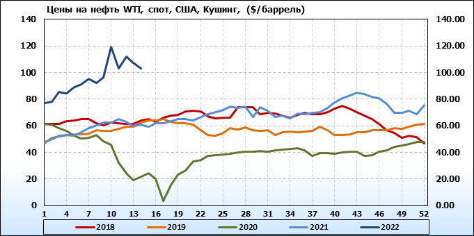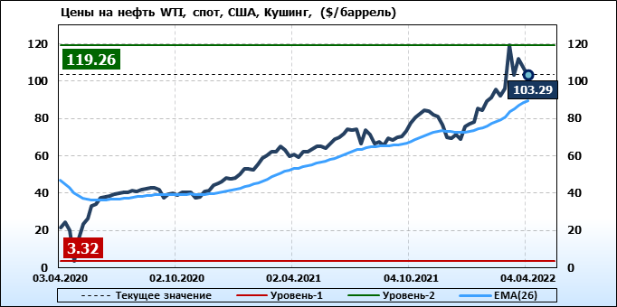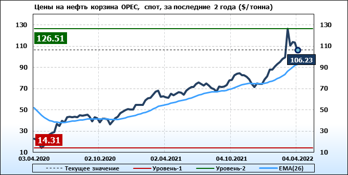 Цены на нефть сорта WTI с базиса поставки Кушинг упали на -4.26 до 103.29 долларов за баррель. Тренд на рынке WTI бычий. Цены на нефть сорта Brent с поставкой из портов ЕС упали на -6.35 до 108.15 долларов за баррель. Тренд на рынке Brent растущий. Цены на корзину сортов нефти стран членов ОПЕК упали на -7.16 до 106.23 долларов за баррель. Ценовая тенденция по корзине ОПЕК направлена вверх. Цена на сорт MARS упала на -18.45 до 93.68 долларов за баррель. Цена на сорт Oman упала на -19.91 до 97.02 долларов за баррель. Сорт марки Dubai подешевел на -8.16 до 103.27 долларов за баррель.