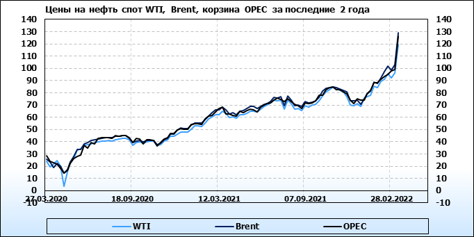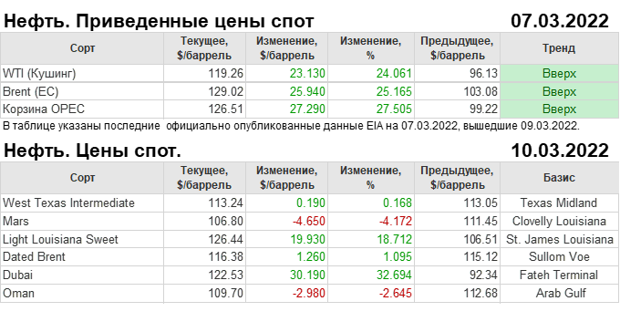 Нефть. Мировые цены спот по сортам и базисам. Данные на 10.03.2022