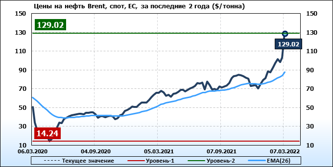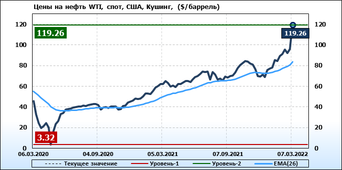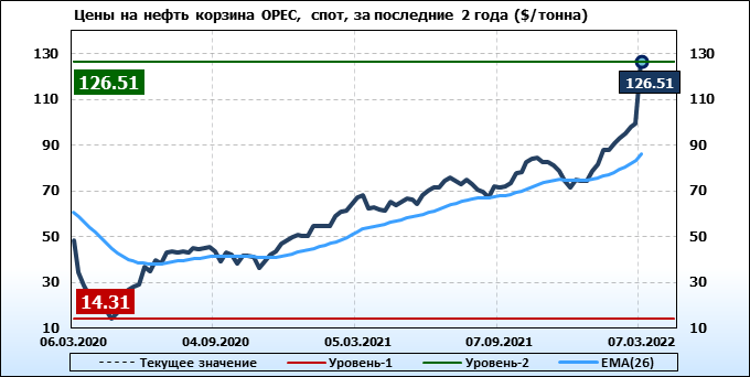 Цены на нефть сорта WTI с базиса поставки Кушинг выросли на 23.13 до 119.26 долларов за баррель. Тренд на рынке WTI бычий. Цены на нефть сорта Brent с поставкой из портов ЕС выросли на 25.94 до 129.02 долларов за баррель. Тренд на рынке Brent растущий. Цены на корзину сортов нефти стран членов ОПЕК выросли на 27.29 до 126.51 долларов за баррель. Ценовая тенденция по корзине ОПЕК направлена вверх. Цена на сорт MARS упала на -4.65 до 106.8 долларов за баррель. Цена на сорт Oman упала на -2.98 до 109.7 долларов за баррель. Сорт марки Dubai подорожал на 30.19 до 122.53 долларов за баррель.