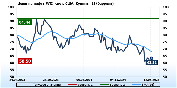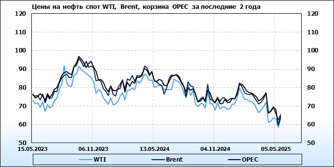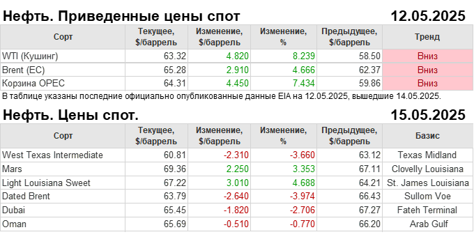 Нефть. Мировые цены спот по сортам и базисам. Данные на 15.05.2025